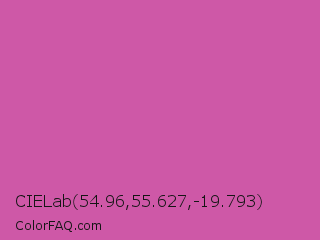 CIELab 54.96,55.627,-19.793 Color is a normal magenta color and the nearest color is Super Pink #cf6ba9. Hex code #ce58a7 and RGB value is rgb(206,88,167). In RGB color space, this color is composed of 81% red, 35% green, 65% blue, In CMYK color space, this color is composed of 0% cyan, 57% magenta, 19% yellow , 19% black , In HSL color space, this color has a hue angle of 320° , 55% saturation and 58% lightness.