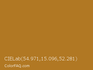 CIELab 54.971,15.096,52.281 Color is a normal orange color and the nearest color is Mandalay #ad781b. Hex code #b17823 and RGB value is rgb(177,120,35). In RGB color space, this color is composed of 69% red, 47% green, 14% blue, In CMYK color space, this color is composed of 0% cyan, 32% magenta, 80% yellow , 31% black , In HSL color space, this color has a hue angle of 36° , 67% saturation and 42% lightness.