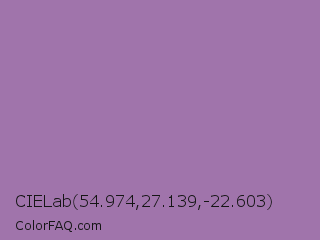 CIELab 54.974,27.139,-22.603 Color is a normal purple color and the nearest color is Wisteria #9771b5. Hex code #a074ab and RGB value is rgb(160,116,171). In RGB color space, this color is composed of 63% red, 45% green, 67% blue, In CMYK color space, this color is composed of 6% cyan, 32% magenta, 0% yellow , 33% black , In HSL color space, this color has a hue angle of 288° , 25% saturation and 56% lightness.