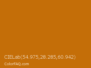 CIELab 54.975,28.285,60.942 Color is a normal orange color and the nearest color is Indochine #c26b03. Hex code #c46e08 and RGB value is rgb(196,110,8). In RGB color space, this color is composed of 77% red, 43% green, 3% blue, In CMYK color space, this color is composed of 0% cyan, 44% magenta, 96% yellow , 23% black , In HSL color space, this color has a hue angle of 33° , 92% saturation and 40% lightness.