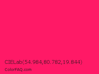 CIELab 54.984,80.782,19.844 Color is a normal rose color and the nearest color is Awesome #ff2052. Hex code #ff1966 and RGB value is rgb(255,25,102). In RGB color space, this color is composed of 100% red, 10% green, 40% blue, In CMYK color space, this color is composed of 0% cyan, 90% magenta, 60% yellow , 0% black , In HSL color space, this color has a hue angle of 340° , 100% saturation and 55% lightness.