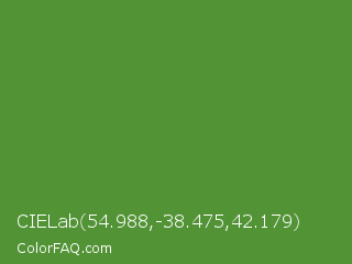 CIELab 54.988,-38.475,42.179 Color is a normal green color and the nearest color is May Green #4c9141. Hex code #529335 and RGB value is rgb(82,147,53). In RGB color space, this color is composed of 32% red, 58% green, 21% blue, In CMYK color space, this color is composed of 44% cyan, 0% magenta, 64% yellow , 42% black , In HSL color space, this color has a hue angle of 101° , 47% saturation and 39% lightness.