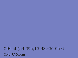 CIELab 54.995,13.48,-36.057 Color is a light blue color and the nearest color is Ship Cove #788bba. Hex code #767fc2 and RGB value is rgb(118,127,194). In RGB color space, this color is composed of 46% red, 50% green, 76% blue, In CMYK color space, this color is composed of 39% cyan, 35% magenta, 0% yellow , 24% black , In HSL color space, this color has a hue angle of 233° , 38% saturation and 61% lightness.