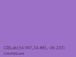 CIELab 54.997,34.881,-39.233 Color is a light purple color and the nearest color is Amethyst #9966cc. Hex code #9d70c8 and RGB value is rgb(157,112,200). In RGB color space, this color is composed of 62% red, 44% green, 78% blue, In CMYK color space, this color is composed of 22% cyan, 44% magenta, 0% yellow , 22% black , In HSL color space, this color has a hue angle of 271° , 44% saturation and 61% lightness.