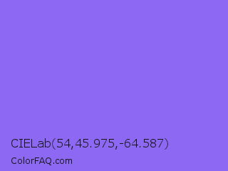 CIELab 54,45.975,-64.587 Color is a light indigo color and the nearest color is Medium Slate Blue #7b68ee. Hex code #8d68f2 and RGB value is rgb(141,104,242). In RGB color space, this color is composed of 55% red, 41% green, 95% blue, In CMYK color space, this color is composed of 42% cyan, 57% magenta, 0% yellow , 5% black , In HSL color space, this color has a hue angle of 256° , 84% saturation and 68% lightness.