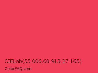 CIELab 55.006,68.913,27.165 Color is a normal red color and the nearest color is Desire #ea3c53. Hex code #f23d59 and RGB value is rgb(242,61,89). In RGB color space, this color is composed of 95% red, 24% green, 35% blue, In CMYK color space, this color is composed of 0% cyan, 75% magenta, 63% yellow , 5% black , In HSL color space, this color has a hue angle of 351° , 87% saturation and 59% lightness.