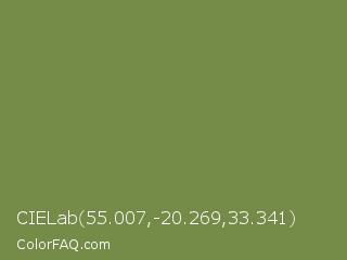 CIELab 55.007,-20.269,33.341 Color is a normal green color and the nearest color is Palm Leaf #6f9940. Hex code #748c48 and RGB value is rgb(116,140,72). In RGB color space, this color is composed of 45% red, 55% green, 28% blue, In CMYK color space, this color is composed of 17% cyan, 0% magenta, 49% yellow , 45% black , In HSL color space, this color has a hue angle of 81° , 32% saturation and 42% lightness.