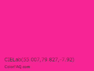 CIELab 55.007,79.827,-7.92 Color is a normal rose color and the nearest color is Persian Rose #fe28a2. Hex code #f52694 and RGB value is rgb(245,38,148). In RGB color space, this color is composed of 96% red, 15% green, 58% blue, In CMYK color space, this color is composed of 0% cyan, 84% magenta, 40% yellow , 4% black , In HSL color space, this color has a hue angle of 328° , 91% saturation and 55% lightness.