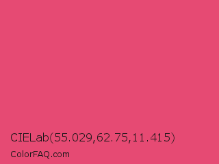 CIELab 55.029,62.75,11.415 Color is a normal rose color and the nearest color is Cabaret #d94972. Hex code #e64a73 and RGB value is rgb(230,74,115). In RGB color space, this color is composed of 90% red, 29% green, 45% blue, In CMYK color space, this color is composed of 0% cyan, 68% magenta, 50% yellow , 10% black , In HSL color space, this color has a hue angle of 344° , 76% saturation and 60% lightness.