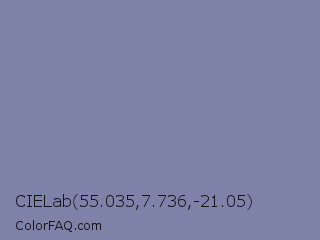CIELab 55.035,7.736,-21.05 Color is a normal blue color and the nearest color is Shadow Blue #778ba5. Hex code #7e81a8 and RGB value is rgb(126,129,168). In RGB color space, this color is composed of 49% red, 51% green, 66% blue, In CMYK color space, this color is composed of 25% cyan, 23% magenta, 0% yellow , 34% black , In HSL color space, this color has a hue angle of 236° , 19% saturation and 58% lightness.
