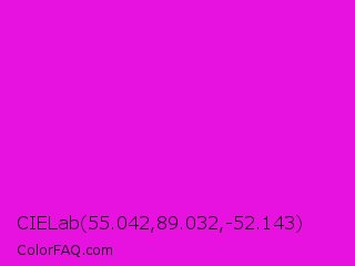 CIELab 55.042,89.032,-52.143 Color is a normal magenta color and the nearest color is Hot Magenta #ff1dce. Hex code #e812e0 and RGB value is rgb(232,18,224). In RGB color space, this color is composed of 91% red, 7% green, 88% blue, In CMYK color space, this color is composed of 0% cyan, 92% magenta, 3% yellow , 9% black , In HSL color space, this color has a hue angle of 302° , 86% saturation and 49% lightness.