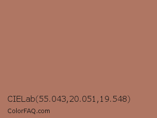 CIELab 55.043,20.051,19.548 Color is a normal color and the nearest color is Copper Penny #ad6f69. Hex code #af7663 and RGB value is rgb(175,118,99). In RGB color space, this color is composed of 69% red, 46% green, 39% blue, In CMYK color space, this color is composed of 0% cyan, 33% magenta, 43% yellow , 31% black , In HSL color space, this color has a hue angle of 15° , 32% saturation and 54% lightness.
