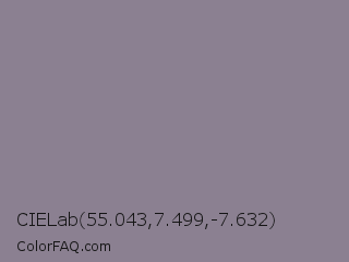 CIELab 55.043,7.499,-7.632 Color is a normal purple color and the nearest color is Mamba #8e8190. Hex code #8b8091 and RGB value is rgb(139,128,145). In RGB color space, this color is composed of 55% red, 50% green, 57% blue, In CMYK color space, this color is composed of 4% cyan, 12% magenta, 0% yellow , 43% black , In HSL color space, this color has a hue angle of 279° , 7% saturation and 54% lightness.