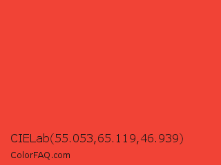 CIELab 55.053,65.119,46.939 Color is a normal red color and the nearest color is Cinnabar #e34234. Hex code #f14336 and RGB value is rgb(241,67,54). In RGB color space, this color is composed of 95% red, 26% green, 21% blue, In CMYK color space, this color is composed of 0% cyan, 72% magenta, 78% yellow , 5% black , In HSL color space, this color has a hue angle of 4° , 87% saturation and 58% lightness.