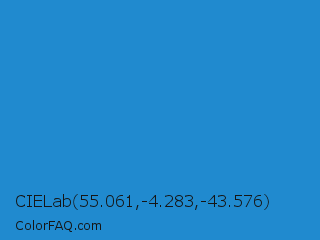 CIELab 55.061,-4.283,-43.576 Color is a normal blue color and the nearest color is Curious Blue #2596d1. Hex code #208acf and RGB value is rgb(32,138,207). In RGB color space, this color is composed of 13% red, 54% green, 81% blue, In CMYK color space, this color is composed of 85% cyan, 33% magenta, 0% yellow , 19% black , In HSL color space, this color has a hue angle of 204° , 73% saturation and 47% lightness.