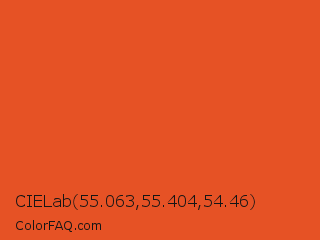 CIELab 55.063,55.404,54.46 Color is a normal red color and the nearest color is Flame #e25822. Hex code #e65225 and RGB value is rgb(230,82,37). In RGB color space, this color is composed of 90% red, 32% green, 15% blue, In CMYK color space, this color is composed of 0% cyan, 64% magenta, 84% yellow , 10% black , In HSL color space, this color has a hue angle of 14° , 79% saturation and 52% lightness.