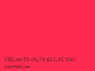 CIELab 55.06,75.812,33.506 Color is a normal red color and the nearest color is Awesome #ff2052. Hex code #fc2b4f and RGB value is rgb(252,43,79). In RGB color space, this color is composed of 99% red, 17% green, 31% blue, In CMYK color space, this color is composed of 0% cyan, 83% magenta, 69% yellow , 1% black , In HSL color space, this color has a hue angle of 350° , 97% saturation and 58% lightness.