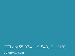 CIELab 55.074,-19.548,-21.918 Color is a normal cyan color and the nearest color is Eastern Blue #1e9ab0. Hex code #2a8fa9 and RGB value is rgb(42,143,169). In RGB color space, this color is composed of 16% red, 56% green, 66% blue, In CMYK color space, this color is composed of 75% cyan, 15% magenta, 0% yellow , 34% black , In HSL color space, this color has a hue angle of 192° , 60% saturation and 41% lightness.