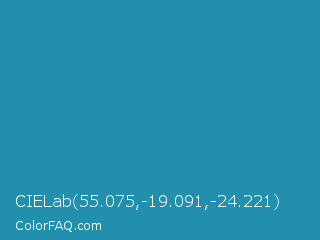 CIELab 55.075,-19.091,-24.221 Color is a normal cyan color and the nearest color is Eastern Blue #1e9ab0. Hex code #228fad and RGB value is rgb(34,143,173). In RGB color space, this color is composed of 13% red, 56% green, 68% blue, In CMYK color space, this color is composed of 80% cyan, 17% magenta, 0% yellow , 32% black , In HSL color space, this color has a hue angle of 193° , 67% saturation and 41% lightness.