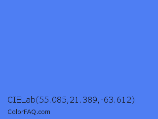 CIELab 55.085,21.389,-63.612 Color is a light blue color and the nearest color is Blueberry #4f86f7. Hex code #4e7ef3 and RGB value is rgb(78,126,243). In RGB color space, this color is composed of 31% red, 49% green, 95% blue, In CMYK color space, this color is composed of 68% cyan, 48% magenta, 0% yellow , 5% black , In HSL color space, this color has a hue angle of 223° , 87% saturation and 63% lightness.