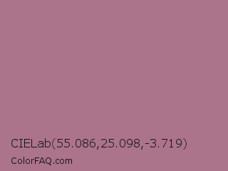 CIELab 55.086,25.098,-3.719 Color is a normal rose color and the nearest color is Turkish Rose #b57281. Hex code #ab748b and RGB value is rgb(171,116,139). In RGB color space, this color is composed of 67% red, 45% green, 55% blue, In CMYK color space, this color is composed of 0% cyan, 32% magenta, 19% yellow , 33% black , In HSL color space, this color has a hue angle of 335° , 25% saturation and 56% lightness.