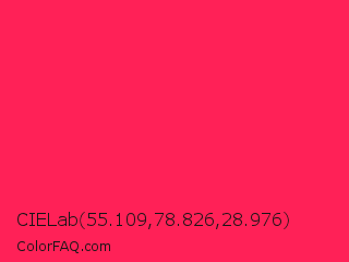CIELab 55.109,78.826,28.976 Color is a normal red color and the nearest color is Awesome #ff2052. Hex code #ff2157 and RGB value is rgb(255,33,87). In RGB color space, this color is composed of 100% red, 13% green, 34% blue, In CMYK color space, this color is composed of 0% cyan, 87% magenta, 66% yellow , 0% black , In HSL color space, this color has a hue angle of 345° , 100% saturation and 56% lightness.