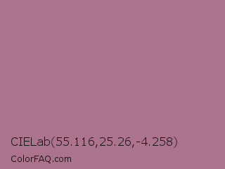 CIELab 55.116,25.26,-4.258 Color is a normal rose color and the nearest color is Turkish Rose #b57281. Hex code #ab748c and RGB value is rgb(171,116,140). In RGB color space, this color is composed of 67% red, 45% green, 55% blue, In CMYK color space, this color is composed of 0% cyan, 32% magenta, 18% yellow , 33% black , In HSL color space, this color has a hue angle of 334° , 25% saturation and 56% lightness.