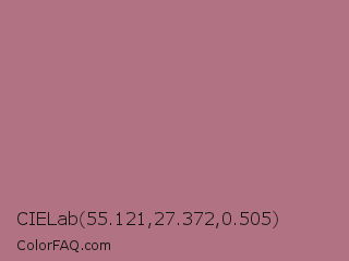 CIELab 55.121,27.372,0.505 Color is a normal rose color and the nearest color is Turkish Rose #b57281. Hex code #b17284 and RGB value is rgb(177,114,132). In RGB color space, this color is composed of 69% red, 45% green, 52% blue, In CMYK color space, this color is composed of 0% cyan, 36% magenta, 25% yellow , 31% black , In HSL color space, this color has a hue angle of 343° , 29% saturation and 57% lightness.