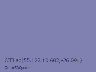 CIELab 55.122,10.602,-26.091 Color is a normal blue color and the nearest color is Wild Blue Yonder #7a89b8. Hex code #7e80b1 and RGB value is rgb(126,128,177). In RGB color space, this color is composed of 49% red, 50% green, 69% blue, In CMYK color space, this color is composed of 29% cyan, 28% magenta, 0% yellow , 31% black , In HSL color space, this color has a hue angle of 238° , 25% saturation and 59% lightness.