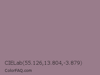 CIELab 55.126,13.804,-3.879 Color is a normal rose color and the nearest color is Mountbatten Pink #997a8d. Hex code #997c8b and RGB value is rgb(153,124,139). In RGB color space, this color is composed of 60% red, 49% green, 55% blue, In CMYK color space, this color is composed of 0% cyan, 19% magenta, 9% yellow , 40% black , In HSL color space, this color has a hue angle of 329° , 12% saturation and 54% lightness.
