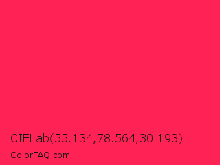 CIELab 55.134,78.564,30.193 Color is a normal red color and the nearest color is Awesome #ff2052. Hex code #ff2255 and RGB value is rgb(255,34,85). In RGB color space, this color is composed of 100% red, 13% green, 33% blue, In CMYK color space, this color is composed of 0% cyan, 87% magenta, 67% yellow , 0% black , In HSL color space, this color has a hue angle of 346° , 100% saturation and 57% lightness.