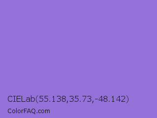 CIELab 55.138,35.73,-48.142 Color is a light indigo color and the nearest color is Medium Purple #9370db. Hex code #9471d8 and RGB value is rgb(148,113,216). In RGB color space, this color is composed of 58% red, 44% green, 85% blue, In CMYK color space, this color is composed of 31% cyan, 48% magenta, 0% yellow , 15% black , In HSL color space, this color has a hue angle of 260° , 57% saturation and 65% lightness.