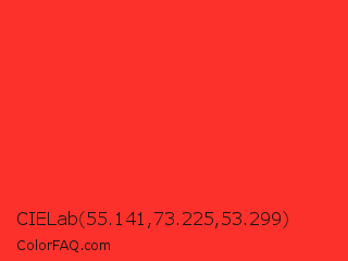 CIELab 55.141,73.225,53.299 Color is a normal red color and the nearest color is Red Orange #ff3f34. Hex code #fc312b and RGB value is rgb(252,49,43). In RGB color space, this color is composed of 99% red, 19% green, 17% blue, In CMYK color space, this color is composed of 0% cyan, 81% magenta, 83% yellow , 1% black , In HSL color space, this color has a hue angle of 2° , 97% saturation and 58% lightness.