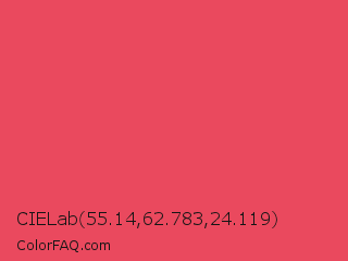 CIELab 55.14,62.783,24.119 Color is a normal red color and the nearest color is Paradise Pink #e63e62. Hex code #ea495e and RGB value is rgb(234,73,94). In RGB color space, this color is composed of 92% red, 29% green, 37% blue, In CMYK color space, this color is composed of 0% cyan, 69% magenta, 60% yellow , 8% black , In HSL color space, this color has a hue angle of 352° , 79% saturation and 60% lightness.