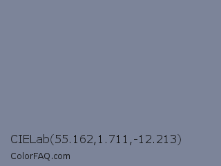 CIELab 55.162,1.711,-12.213 Color is a normal blue color and the nearest color is Light Slate Gray #778899. Hex code #7c8499 and RGB value is rgb(124,132,153). In RGB color space, this color is composed of 49% red, 52% green, 60% blue, In CMYK color space, this color is composed of 19% cyan, 14% magenta, 0% yellow , 40% black , In HSL color space, this color has a hue angle of 223° , 12% saturation and 54% lightness.