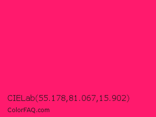CIELab 55.178,81.067,15.902 Color is a normal rose color and the nearest color is Vivid Raspberry #ff006c. Hex code #ff1a6d and RGB value is rgb(255,26,109). In RGB color space, this color is composed of 100% red, 10% green, 43% blue, In CMYK color space, this color is composed of 0% cyan, 90% magenta, 57% yellow , 0% black , In HSL color space, this color has a hue angle of 338° , 100% saturation and 55% lightness.