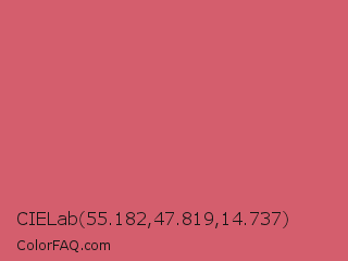 CIELab 55.182,47.819,14.737 Color is a normal red color and the nearest color is Fuzzy Wuzzy #cc6666. Hex code #d45e6d and RGB value is rgb(212,94,109). In RGB color space, this color is composed of 83% red, 37% green, 43% blue, In CMYK color space, this color is composed of 0% cyan, 56% magenta, 49% yellow , 17% black , In HSL color space, this color has a hue angle of 352° , 58% saturation and 60% lightness.