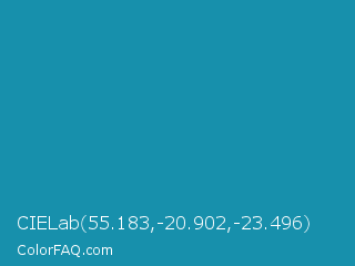 CIELab 55.183,-20.902,-23.496 Color is a normal cyan color and the nearest color is Eastern Blue #1e9ab0. Hex code #1790ac and RGB value is rgb(23,144,172). In RGB color space, this color is composed of 9% red, 56% green, 67% blue, In CMYK color space, this color is composed of 87% cyan, 16% magenta, 0% yellow , 33% black , In HSL color space, this color has a hue angle of 191° , 76% saturation and 38% lightness.