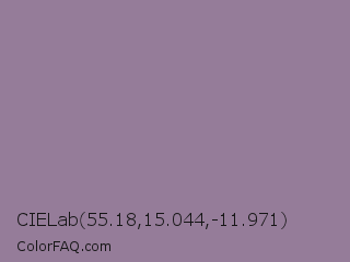 CIELab 55.18,15.044,-11.971 Color is a normal magenta color and the nearest color is Mamba #8e8190. Hex code #957c99 and RGB value is rgb(149,124,153). In RGB color space, this color is composed of 58% red, 49% green, 60% blue, In CMYK color space, this color is composed of 3% cyan, 19% magenta, 0% yellow , 40% black , In HSL color space, this color has a hue angle of 292° , 12% saturation and 54% lightness.
