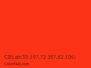 CIELab 55.197,72.357,62.106 Color is a normal red color and the nearest color is Red RYB #fe2712. Hex code #fc3316 and RGB value is rgb(252,51,22). In RGB color space, this color is composed of 99% red, 20% green, 9% blue, In CMYK color space, this color is composed of 0% cyan, 80% magenta, 91% yellow , 1% black , In HSL color space, this color has a hue angle of 8° , 97% saturation and 54% lightness.