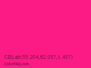 CIELab 55.204,82.057,1.457 Color is a normal rose color and the nearest color is Fluorescent Pink #ff1493. Hex code #fc1a85 and RGB value is rgb(252,26,133). In RGB color space, this color is composed of 99% red, 10% green, 52% blue, In CMYK color space, this color is composed of 0% cyan, 90% magenta, 47% yellow , 1% black , In HSL color space, this color has a hue angle of 332° , 97% saturation and 55% lightness.