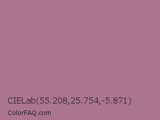 CIELab 55.208,25.754,-5.871 Color is a normal rose color and the nearest color is Turkish Rose #b57281. Hex code #ab748f and RGB value is rgb(171,116,143). In RGB color space, this color is composed of 67% red, 45% green, 56% blue, In CMYK color space, this color is composed of 0% cyan, 32% magenta, 16% yellow , 33% black , In HSL color space, this color has a hue angle of 331° , 25% saturation and 56% lightness.