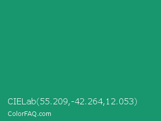 CIELab 55.209,-42.264,12.053 Color is a normal green color and the nearest color is Green Crayola #1cac78. Hex code #18966e and RGB value is rgb(24,150,110). In RGB color space, this color is composed of 9% red, 59% green, 43% blue, In CMYK color space, this color is composed of 84% cyan, 0% magenta, 27% yellow , 41% black , In HSL color space, this color has a hue angle of 161° , 72% saturation and 34% lightness.