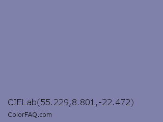 CIELab 55.229,8.801,-22.472 Color is a normal blue color and the nearest color is Shadow Blue #778ba5. Hex code #7f81ab and RGB value is rgb(127,129,171). In RGB color space, this color is composed of 50% red, 51% green, 67% blue, In CMYK color space, this color is composed of 26% cyan, 25% magenta, 0% yellow , 33% black , In HSL color space, this color has a hue angle of 237° , 21% saturation and 58% lightness.