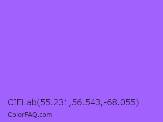 CIELab 55.231,56.543,-68.055 Color is a light violet color and the nearest color is Navy Purple #9457eb. Hex code #a161fc and RGB value is rgb(161,97,252). In RGB color space, this color is composed of 63% red, 38% green, 99% blue, In CMYK color space, this color is composed of 36% cyan, 62% magenta, 0% yellow , 1% black , In HSL color space, this color has a hue angle of 265° , 96% saturation and 68% lightness.