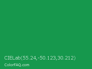 CIELab 55.24,-50.123,30.212 Color is a normal green color and the nearest color is Spanish Green #009150. Hex code #16984d and RGB value is rgb(22,152,77). In RGB color space, this color is composed of 9% red, 60% green, 30% blue, In CMYK color space, this color is composed of 86% cyan, 0% magenta, 49% yellow , 40% black , In HSL color space, this color has a hue angle of 145° , 75% saturation and 34% lightness.
