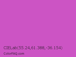 CIELab 55.24,61.388,-36.154 Color is a normal magenta color and the nearest color is Fuchsia Pink #c154c1. Hex code #cc54c4 and RGB value is rgb(204,84,196). In RGB color space, this color is composed of 80% red, 33% green, 77% blue, In CMYK color space, this color is composed of 0% cyan, 59% magenta, 4% yellow , 20% black , In HSL color space, this color has a hue angle of 304° , 54% saturation and 56% lightness.