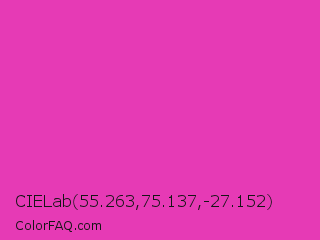 CIELab 55.263,75.137,-27.152 Color is a normal magenta color and the nearest color is Frostbite #e936a7. Hex code #e63ab5 and RGB value is rgb(230,58,181). In RGB color space, this color is composed of 90% red, 23% green, 71% blue, In CMYK color space, this color is composed of 0% cyan, 75% magenta, 21% yellow , 10% black , In HSL color space, this color has a hue angle of 317° , 77% saturation and 56% lightness.