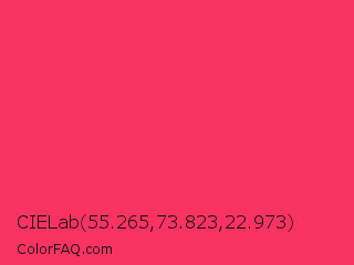CIELab 55.265,73.823,22.973 Color is a normal red color and the nearest color is Radical Red #ff355e. Hex code #f83361 and RGB value is rgb(248,51,97). In RGB color space, this color is composed of 97% red, 20% green, 38% blue, In CMYK color space, this color is composed of 0% cyan, 79% magenta, 61% yellow , 3% black , In HSL color space, this color has a hue angle of 346° , 93% saturation and 59% lightness.