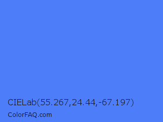 CIELab 55.267,24.44,-67.197 Color is a light blue color and the nearest color is Blueberry #4f86f7. Hex code #4e7dfa and RGB value is rgb(78,125,250). In RGB color space, this color is composed of 31% red, 49% green, 98% blue, In CMYK color space, this color is composed of 69% cyan, 50% magenta, 0% yellow , 2% black , In HSL color space, this color has a hue angle of 224° , 95% saturation and 64% lightness.